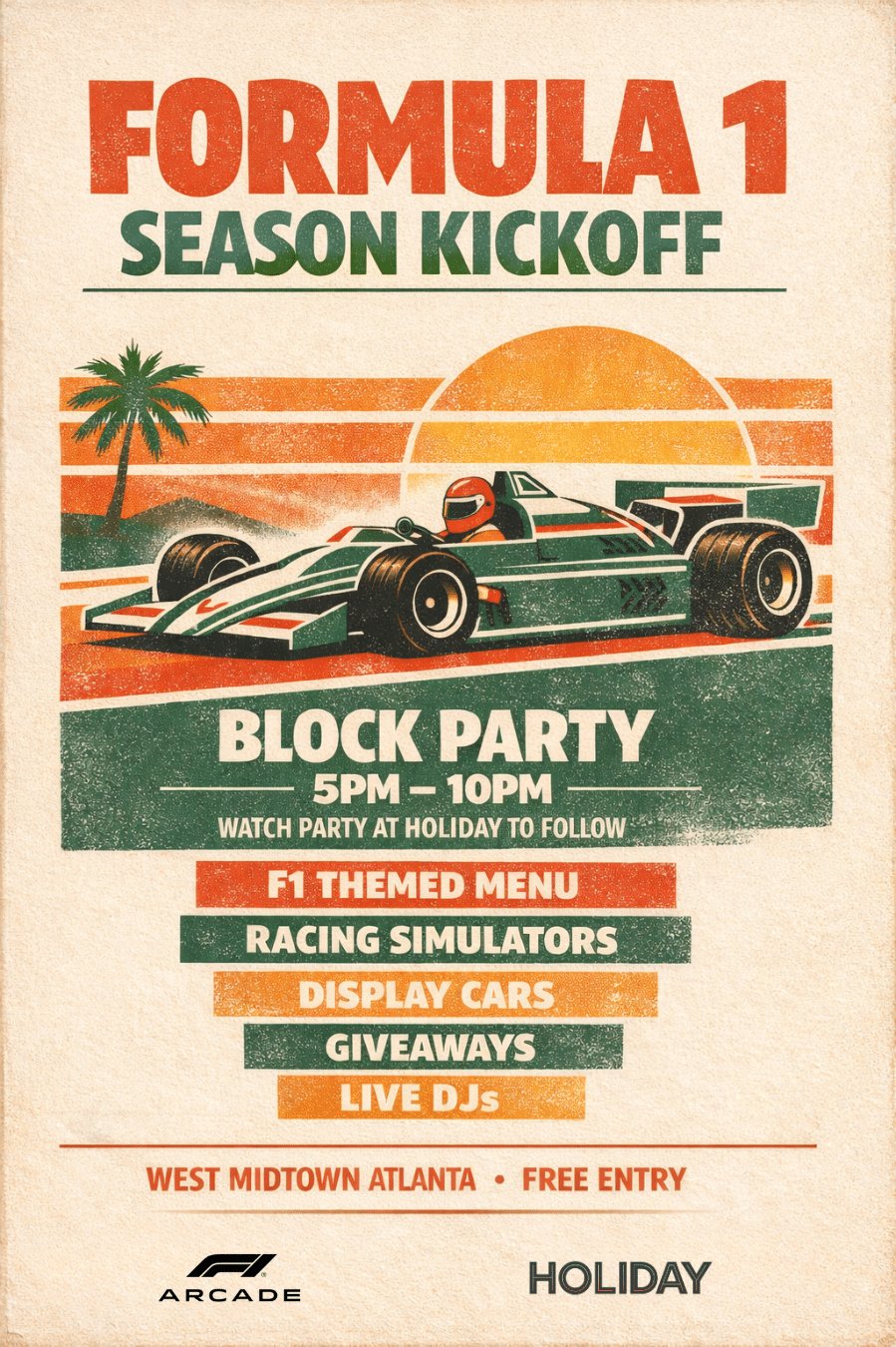 Join us from 5PMβ10PM in West Midtown for a full-blown block party celebrating the return of Formula 1. Expect racing simulators, display cars, live DJs, giveaways, and an F1-themed menu built for race day energy.